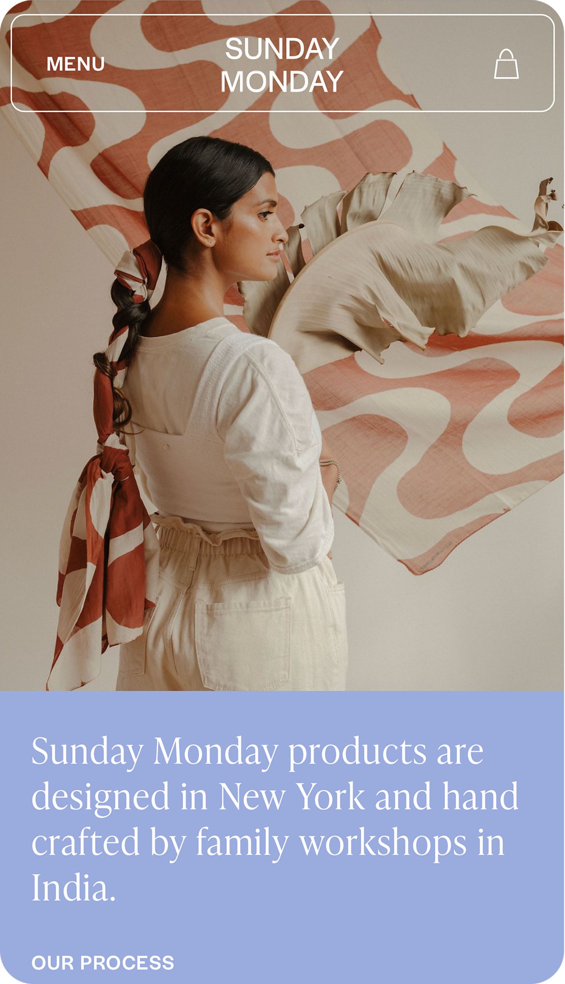 Sunday Monday is a textile brand focused on celebrating Indian craft traditions, color, and nature, with minimal harm to the environment. We created a versatile system of colors and typography that allows Sunday Monday to highlight their collection and process throughout the website.